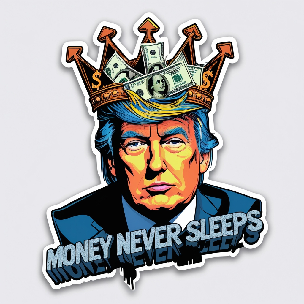 A bold, urban-style sticker featuring **Donald Trump** wearing a crown, symbolizing financial power and dominance. **His hair** is infused with dollar bills and stock arrows pointing upward. The words ‘MONEY NEVER SLEEPS’ appear in a graffiti-style font with a 3D effect, giving it a street-smart edge. The sticker is outlined in a thick white stroke for a crisp, polished look on T-shirts.”