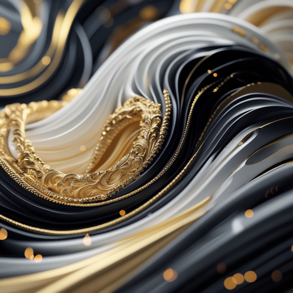 A fluid, abstract design with swirling gradients of gold, black, and white, evoking luxury and elegance.