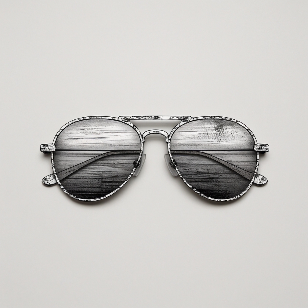 A retro **pilot's aviator glasses** design featuring a monochrome, distressed finish. The **glasses' lenses** form a sleek, curved shape, with the frames showing intricate line textures that evoke a sense of depth and history. Simplified elements like the **nose bridge and temples** are suggested through subtle textural shifts, maintaining a cohesive, vintage appeal. Placed against a plain white background, the design stands out boldly.