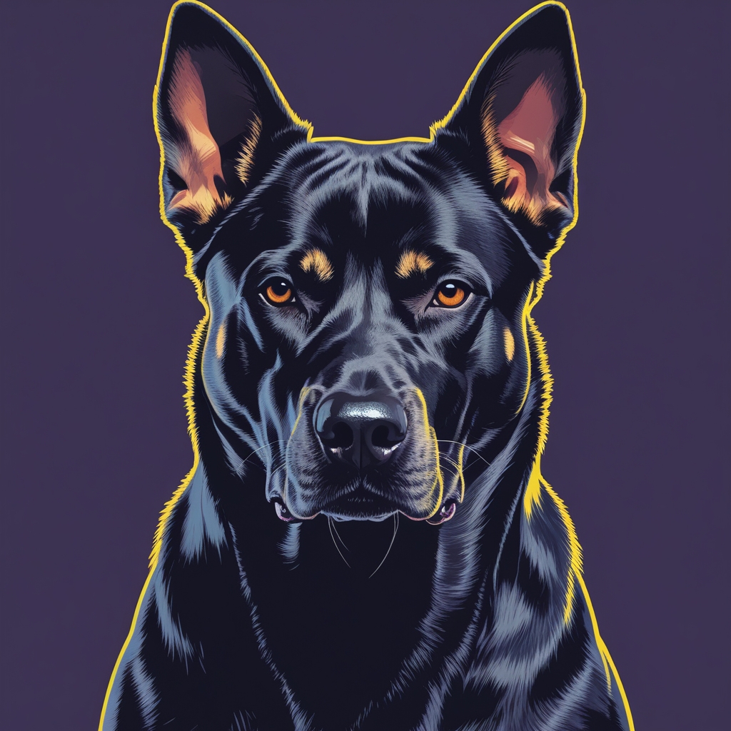 A sleek, muscular **Malinois** dog with a powerful, intimidating muzzle, its dark coat glistening in the light, its eyes piercing and alert, its ears erect and pointed, its facial features strong and pronounced, its jawline angular and sharp, conveying a sense of strength and ferocity.