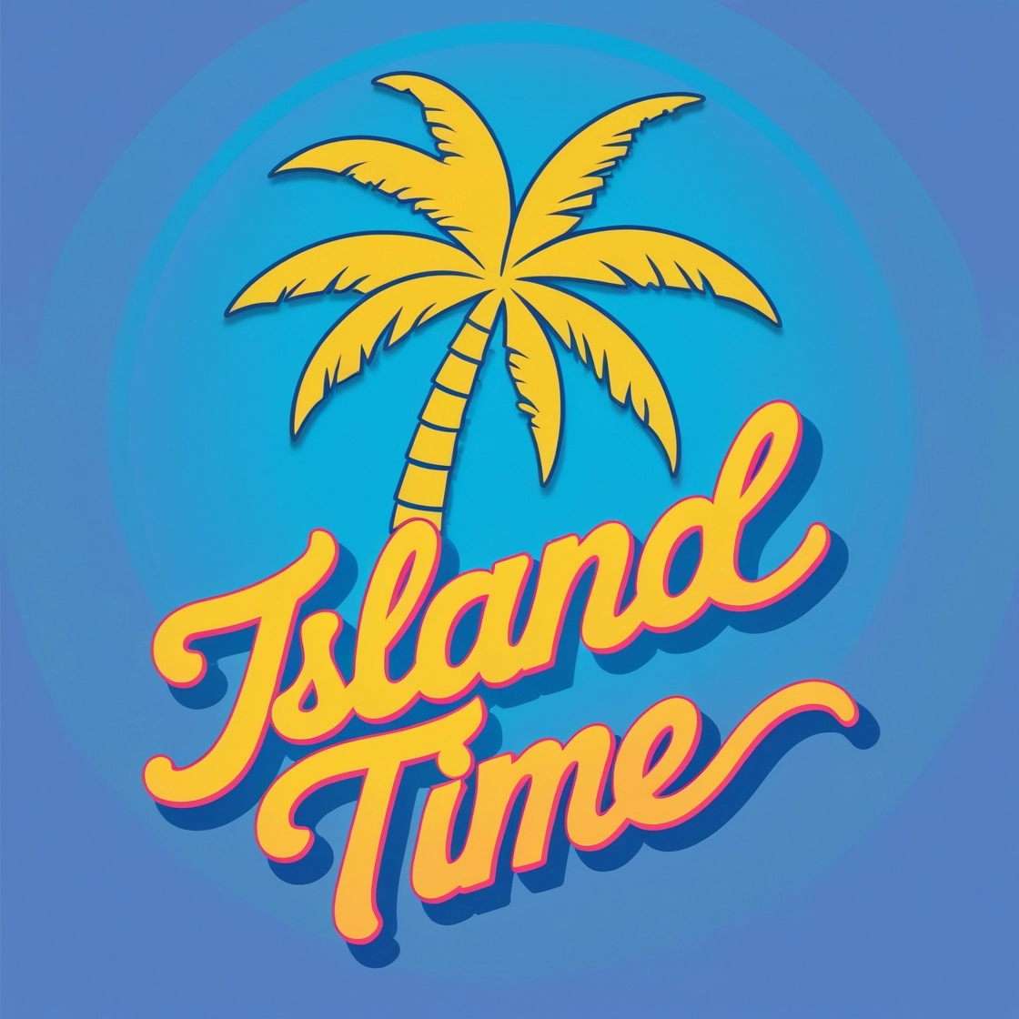 Minimalist palm tree (trunk + 3 fronds) with 'Island Time'
