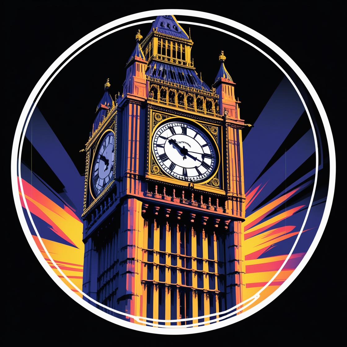 A vibrant, professional graphic design in a pop art style, set against a sleek black background, features the iconic Big Ben clock tower within a stylized, white, bold-lined round frame. The frame's top edge slightly breaches the circular perimeter, adding a dynamic touch. Warm, golden rays of the setting sun cast a dramatic glow on the clock tower's intricately designed Roman numerals, Gothic details, and majestic clock faces. The pop art aesthetic is characterized by bold, saturated colors, graphic shapes, and a sense of nostalgia. The circular frame is outlined with a thin, white keyline, adding depth and visual interest. The overall design exudes a sense of urban chic, modernity, and British heritage.