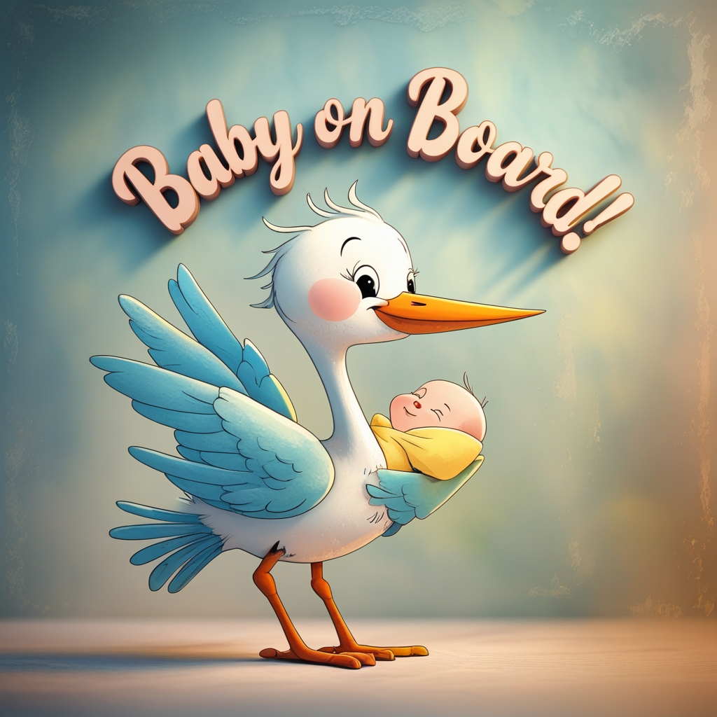 Cute baby shower T-shirt design with a cartoon stork carrying a baby, pastel colors, and the text 'Baby on Board!' in playful font."