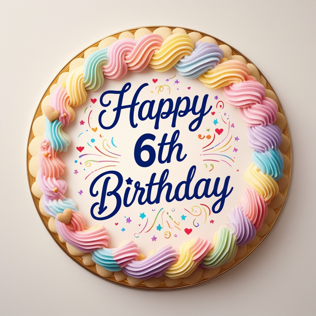 A whimsical illustration of the **"Happy 6th Birthday"** header, featuring a delightful composition of colorful pastel hues and delicate, swirling patterns resembling frosting and sprinkles. The **text** is written in bold, cursive script with a mix of thick and thin lines, adorned with tiny stars and hearts that add to the playful atmosphere. The text is centered within a circular border, resembling a wreath made of layered cookies or pastry dough. The background is a soft, creamy white, evoking the feeling of freshly baked goods. The entire design is framed by a subtle, golden border, adding a touch of luxury and warmth. The overall style is reminiscent of a vintage, hand-drawn advertisement, with bold lines, soft textures, and a sense of nostalgia.