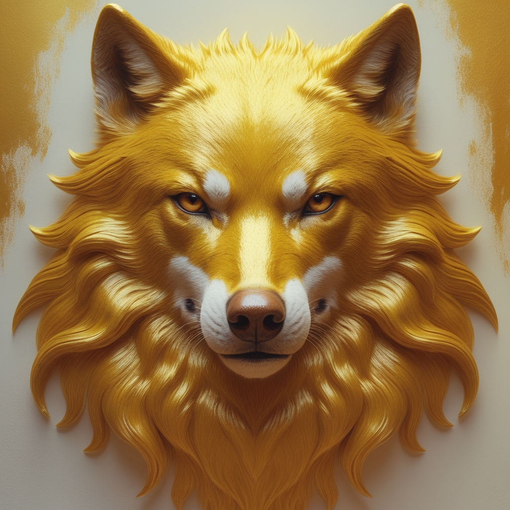 Create a majestic golden wolf's face, elegant, golden font, with serif edges and subtle texture, above the wolf's forehead, in a slightly curved line that follows the natural curve of the wolf's fur, which is depicted in a lush, vibrant shade of golden yellow, with subtle hints of brown and orange, and a regal, powerful expression, with piercing brown eyes, a strong, straight nose, and a majestic, flowing fur that frames the wolf's face, set against a warm, golden background that gradates to a soft, creamy white towards the edges, with subtle texture and depth, evoking a sense of ancient, mystical power and wisdom.