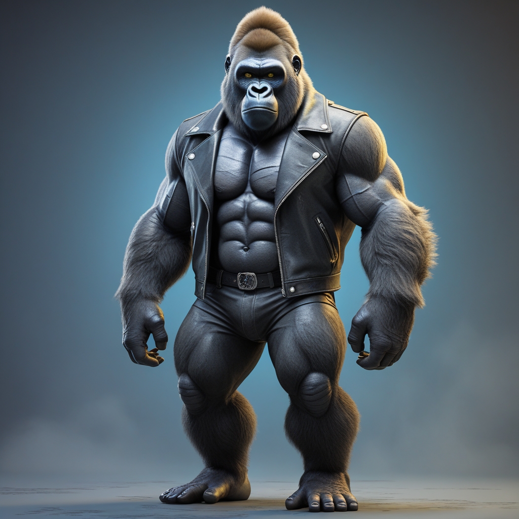 I want a drawing of a gorilla, specifically a muscular silverback gorilla, standing upright on its feet, wearing a fitted black leather jacket with silver metal buttons, the jacket adorned with subtle scratches and worn edges, the gorilla's fur a muted grayish-brown color with a scattering of darker tones, its eyes a piercing yellow with a focused gaze, the gorilla's facial expression a mix of toughness and charm, the background a muted, gradient blue to represent a misty jungle atmosphere, the gorilla positioned in a confident, relaxed stance, one arm resting casually on its hip, the overall style a blend of realistic textures and cartoonish exaggeration, with bold lines and vibrant colors.