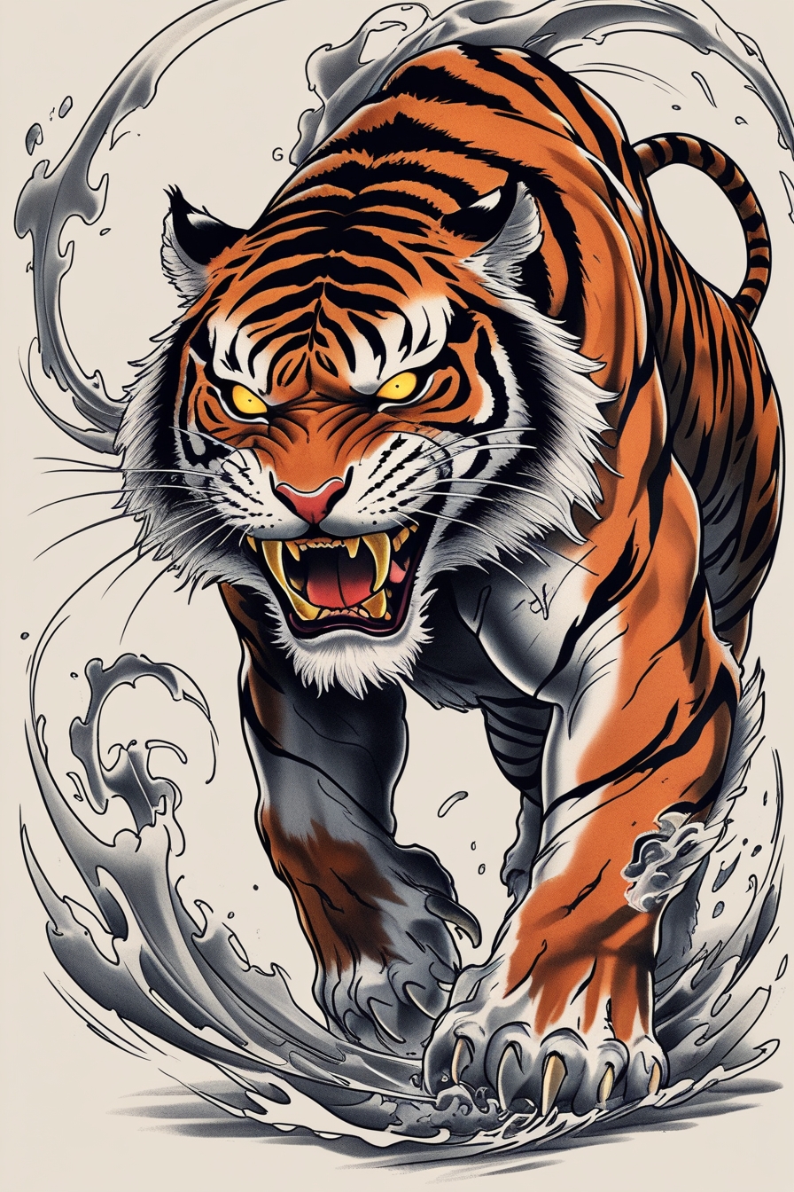 "Tattoo-style illustration of a fierce, majestic tiger in a powerful stance, its muscular body tensed and ready to strike. The tiger’s eyes are intensely focused, glowing with raw energy, while its sharp fangs and extended claws add to its menacing presen
