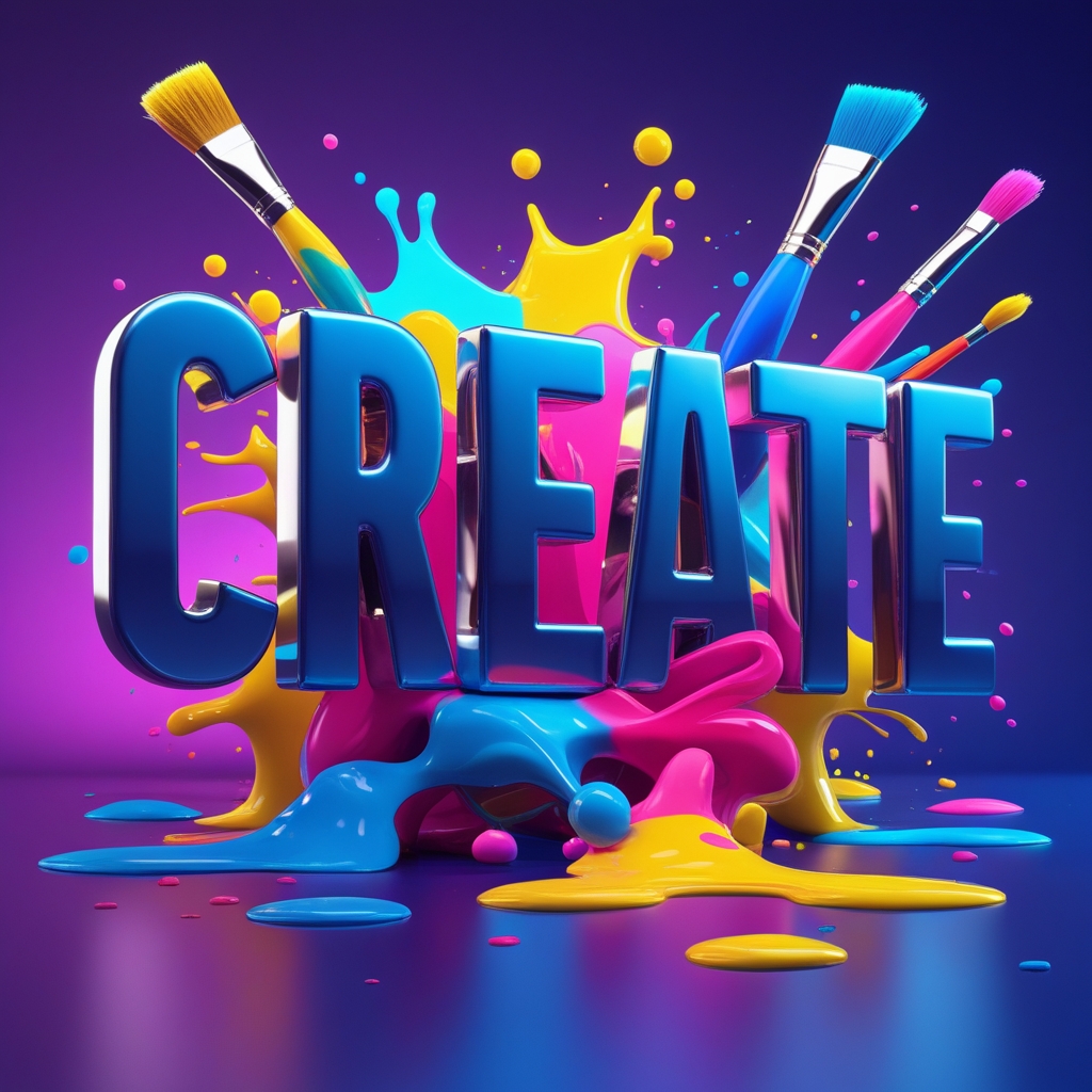 A bold, graphic design with the word 'Create' in 3D letters, surrounded by paint splashes and brushes.