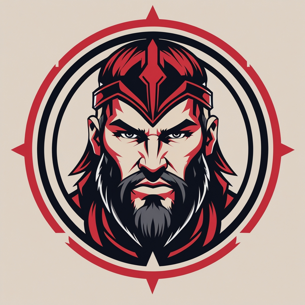 Create a circular logo featuring the face of **Kratos**, wearing his iconic warrior attire. The design should be bold and dynamic, inspired by the style of NBA team logos, with sharp lines, strong contrast, and a modern sports emblem aesthetic. The color palette should be powerful and striking, incorporating deep reds, blacks, and metallic accents to emphasize strength and ferocity. Ensure the design is clean, professional, and visually impactful.